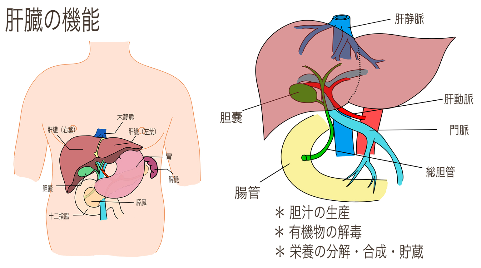 『肝臓』は右上腹部、横隔膜の下にある人体で最大の臓器です。肝臓にはタンパク質などの合成や貯蔵、アンモニアやアルコールなどの有害物質の解毒や分解、消化に必要な胆汁の産生という3つの主な機能を持っています。その複雑な機能のため、肝臓には腎不全時に行う血液透析のような代替手段がなく、肝臓がなんらかの理由で機能不全に陥った場合には、患者さんの肝臓を健康な肝臓と取り替える『肝移植』が唯一の救命手段です。