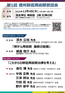 第1回 信州肺癌周術期懇話会が、アストラゼネカ株式会社の協賛により松本市で開催されました。本会は、会場での対面参加に加え、Zoomを利用したオンライン配信のハイブリッド形式で行われました。特別講演では、慶應義塾大学医学部外科学(呼吸器) 教授の朝倉 啓介先生をお招きし、「肺がん周術期 最新の話題」をテーマにご講演いただきました。座長は、当教室の清水が務めました。
