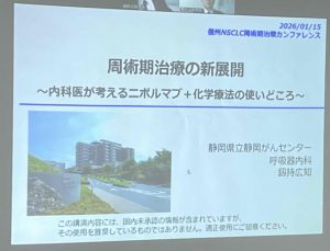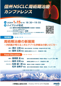 信州NSCLC周術期治療カンファレンスは、小野薬品工業株式会社/ブリストル・マイヤーズ スクイブ株式会社のご協賛のもと、信州大学医学部附属病院にて開催されました。当日は、会場での対面参加に加え、Zoomによるオンライン配信も併用したハイブリッド形式で実施しました。特別講演では、静岡県立静岡がんセンター 呼吸器内科 部長の釼持 広知先生をお招きし、「周術期治療の新展開 ~内科医が考えるニボルマブ+化学療法の使いどころ~」をご講演いただきました。座長は当教室の清水が務めました。