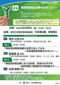 周術期肺癌治療WEBセミナーが、MSD株式会社協賛のもと、信州大学医学部附属病院にて開催されました。当日は、会場での対面参加に加え、Zoomによるオンライン配信も併用したハイブリッド形式で実施しました。講演は2本立てとなり、