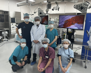 次回もどうぞご期待ください。取材を終えた後の記念写真です。呼吸器外科の担当の看護師さんと、Saroaを開発したリバーフィールド社の皆さんです。今回はSaroaを一から開発した只野社長(白衣)も来てSaroaの機能について解説をしてくれました。「ありがとうございます」